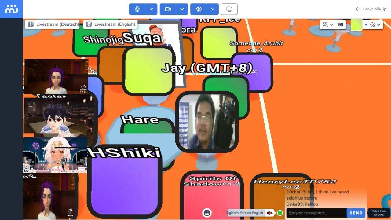 Aside from Discord and Twitch, DigiKomi has its own virtual platform provided by MixUp. Imagine this: You are a rounded square. All of you inside the virtual convention floor are rounded squares. If the camera’s on, we can see you. This is a perfect opportunity for VTubers to introduce themselves.
